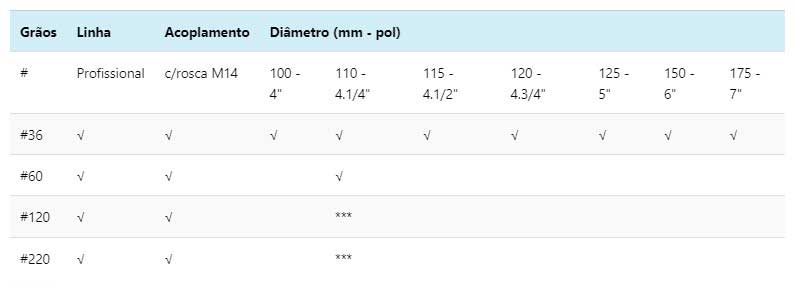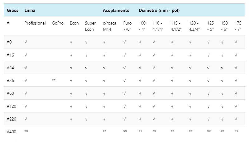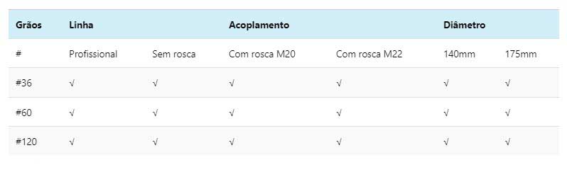 Nossos discos de desbaste estão disponíveis em diferentes diâmetros, variando de 100mm a 175mm, com granulometrias que vão desde #0 até #220. Com isso, oferecemos uma ampla variedade de opções para atender às necessidades específicas de cada projeto.