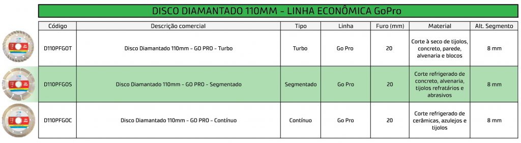 TABELA DISCO DIAMANTADO 110MM - LINHA GOPRO