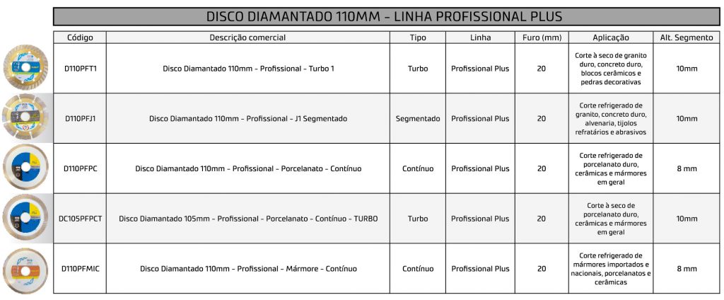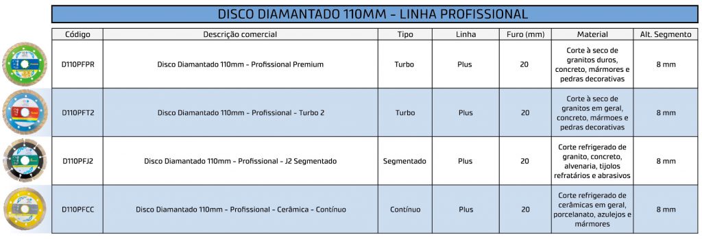 TABELA DISCO DIAMANTADO 110MM - LINHA PLUS E PRO