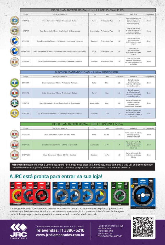 O disco diamantado mais usual abaixo dos 350mm, por isso a JRC Diamantados se preocupou na fabricação de uma linha mais completa. Com seu tamanho mediano é versátil e de bom rendimento para o corte de concreto. Apresentamos o disco diamantado 230mm em 3 versões, na linha PLUS e econômica GoPro: